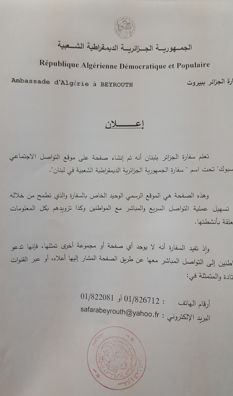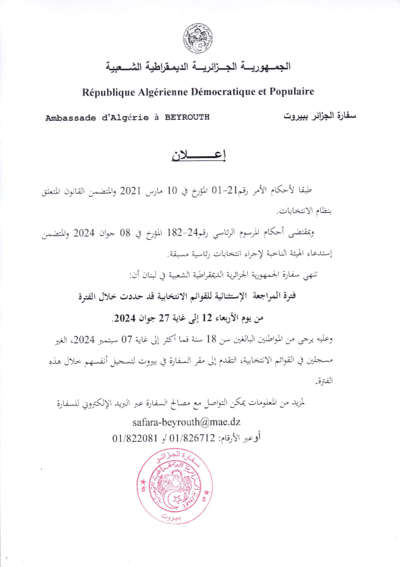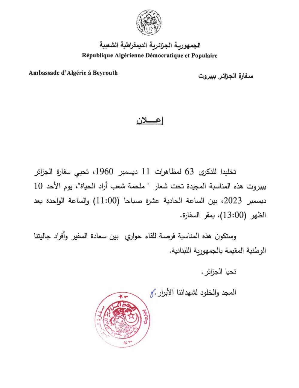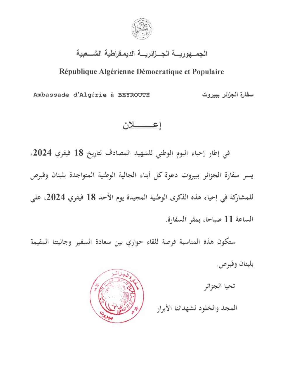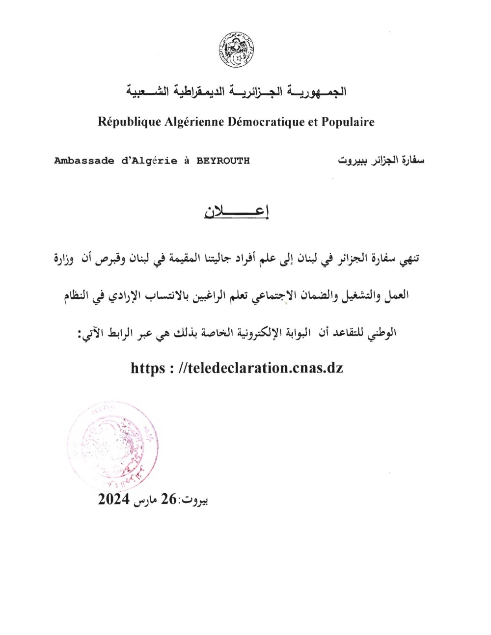 تنهي سفارة الجزائر ببيروت إلى علم كافة أفراد جاليتنا المقيمة بلبن... اقرأ المزيد