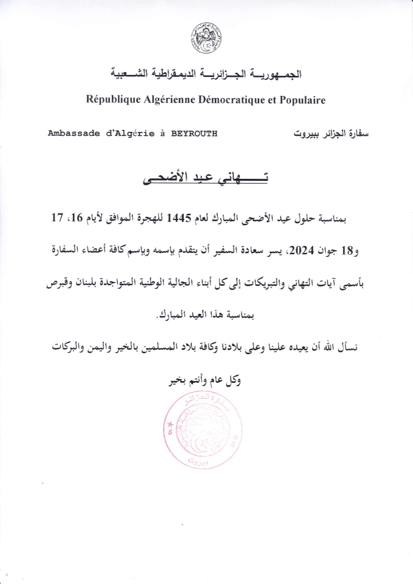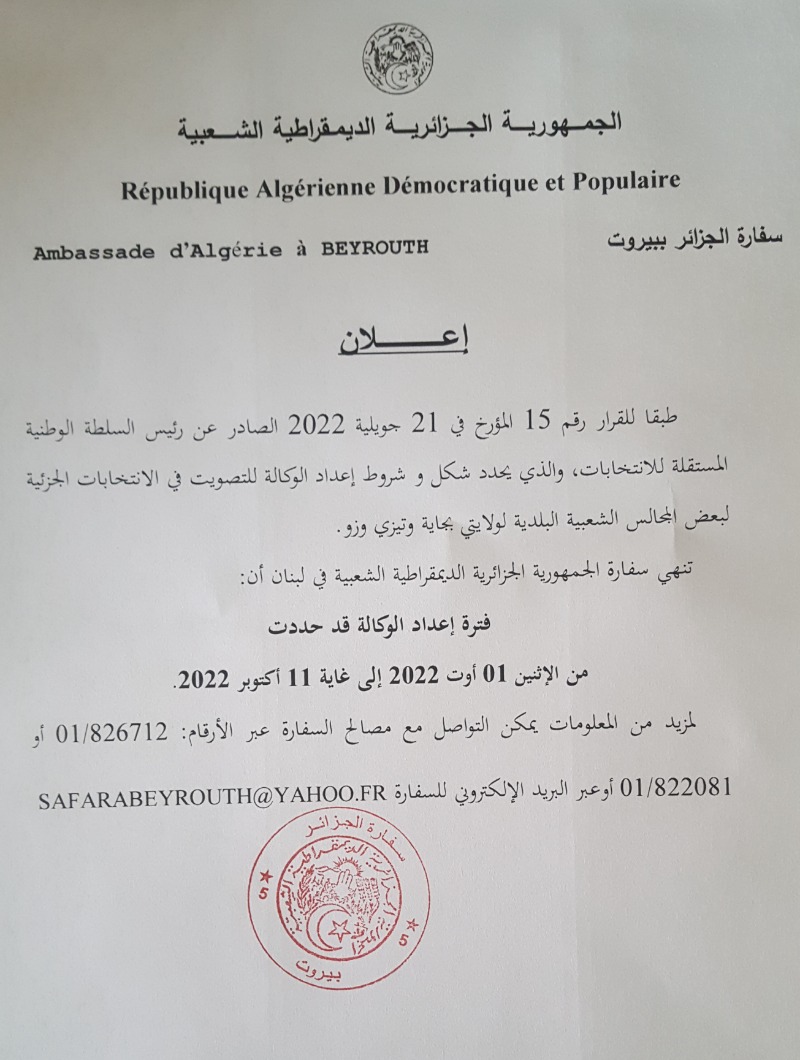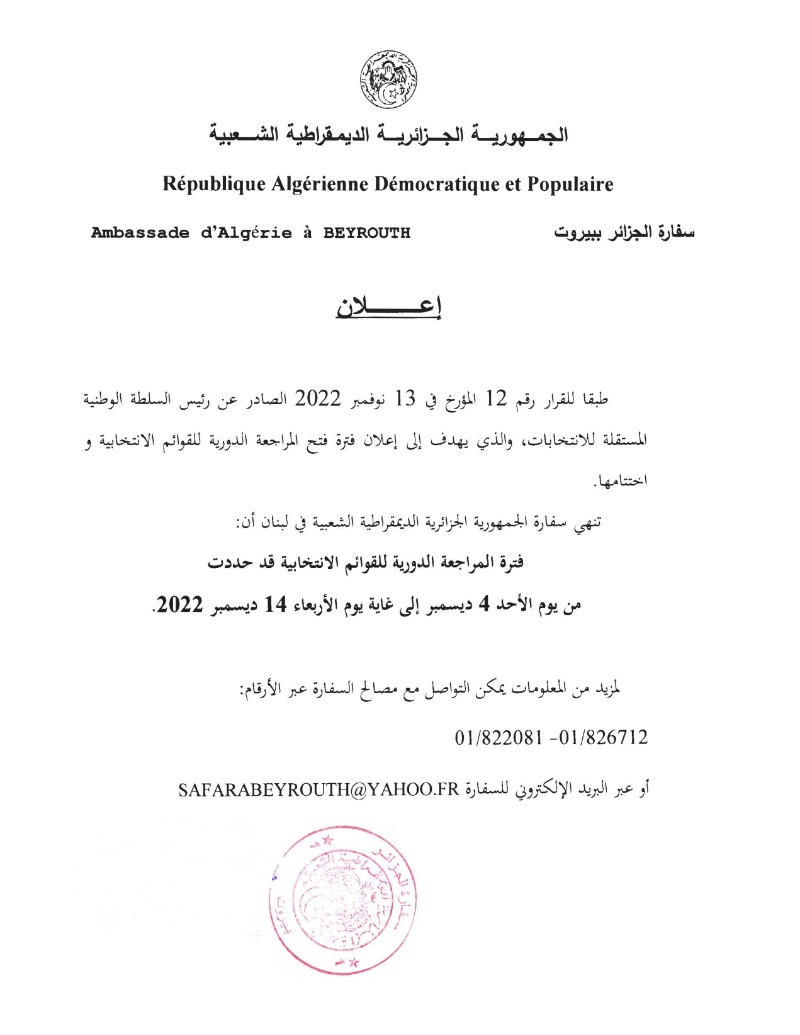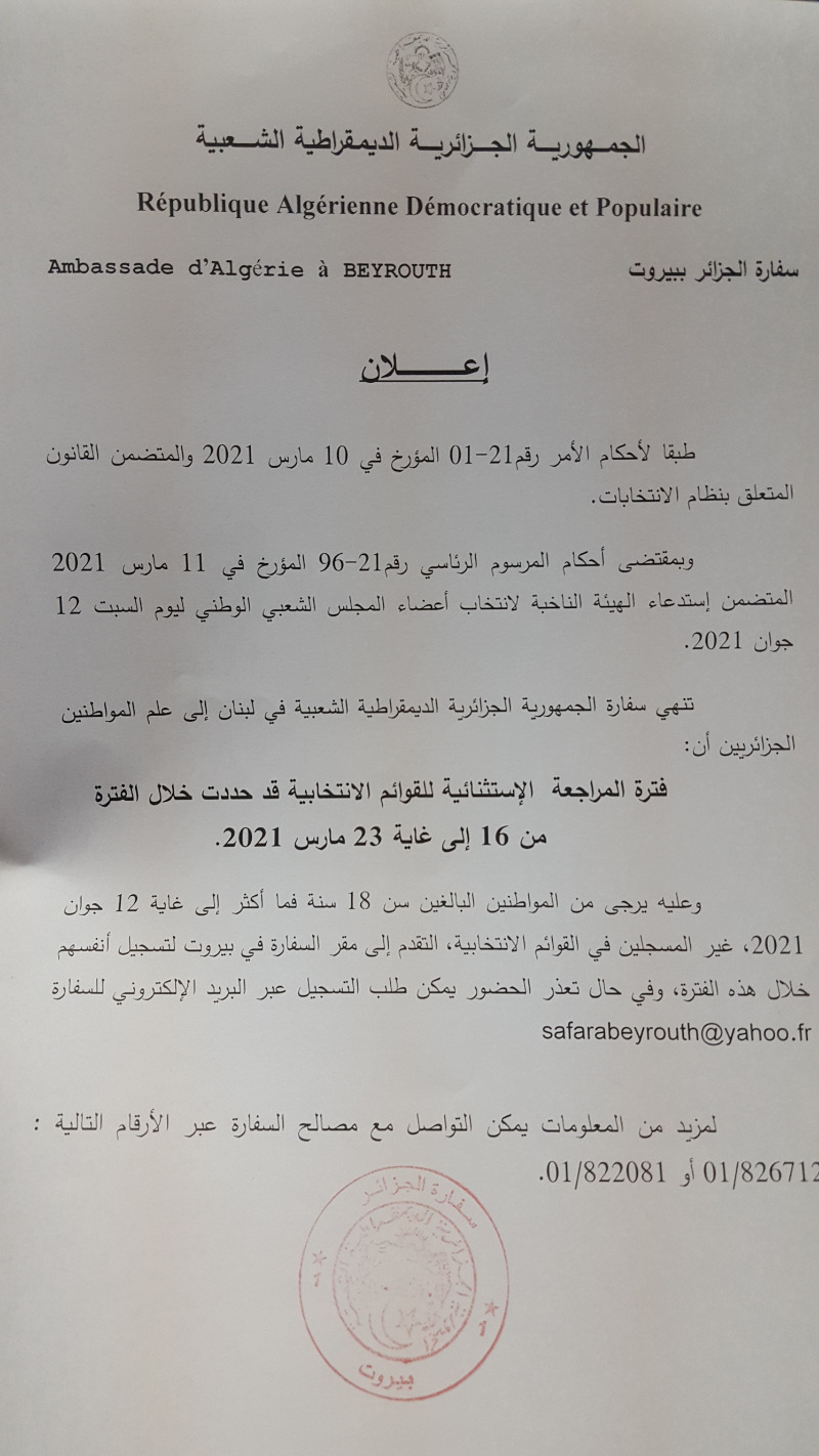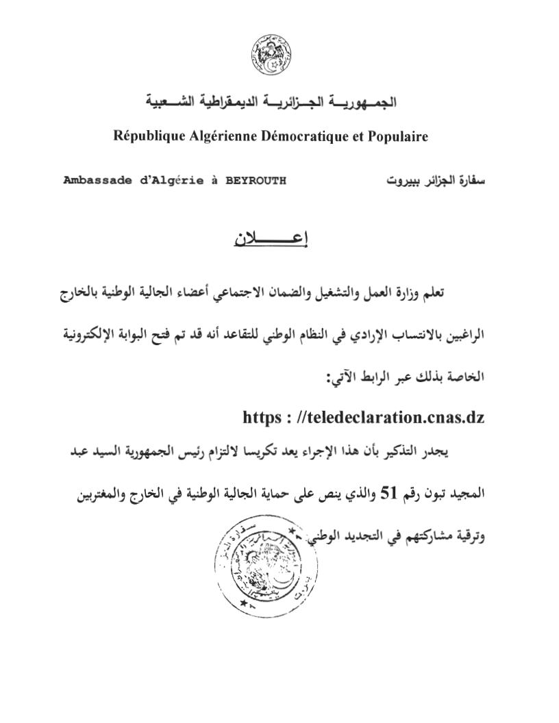 تنهي سفارة الجزائر ببيروت إلى علم كافة أفراد جاليتنا المقيمة بلبن... اقرأ المزيد