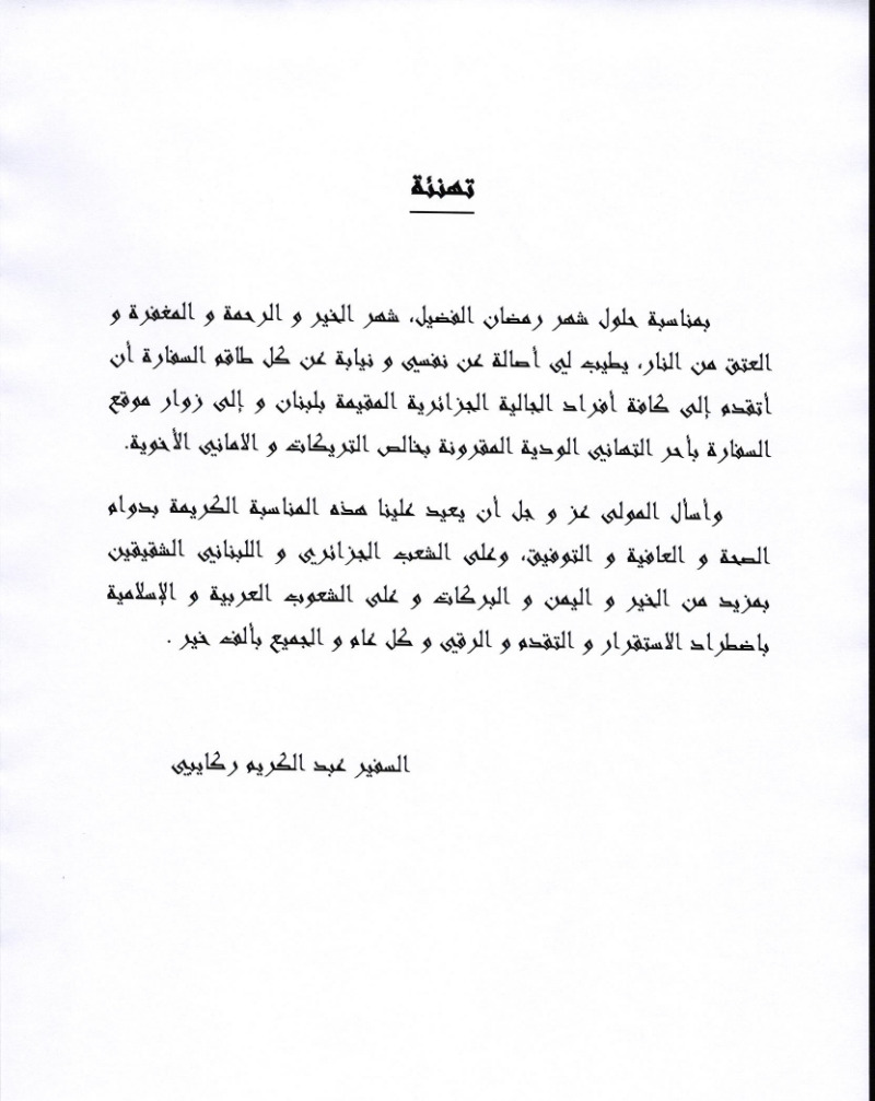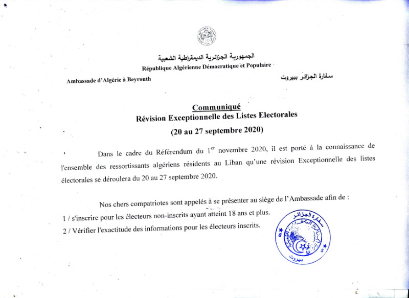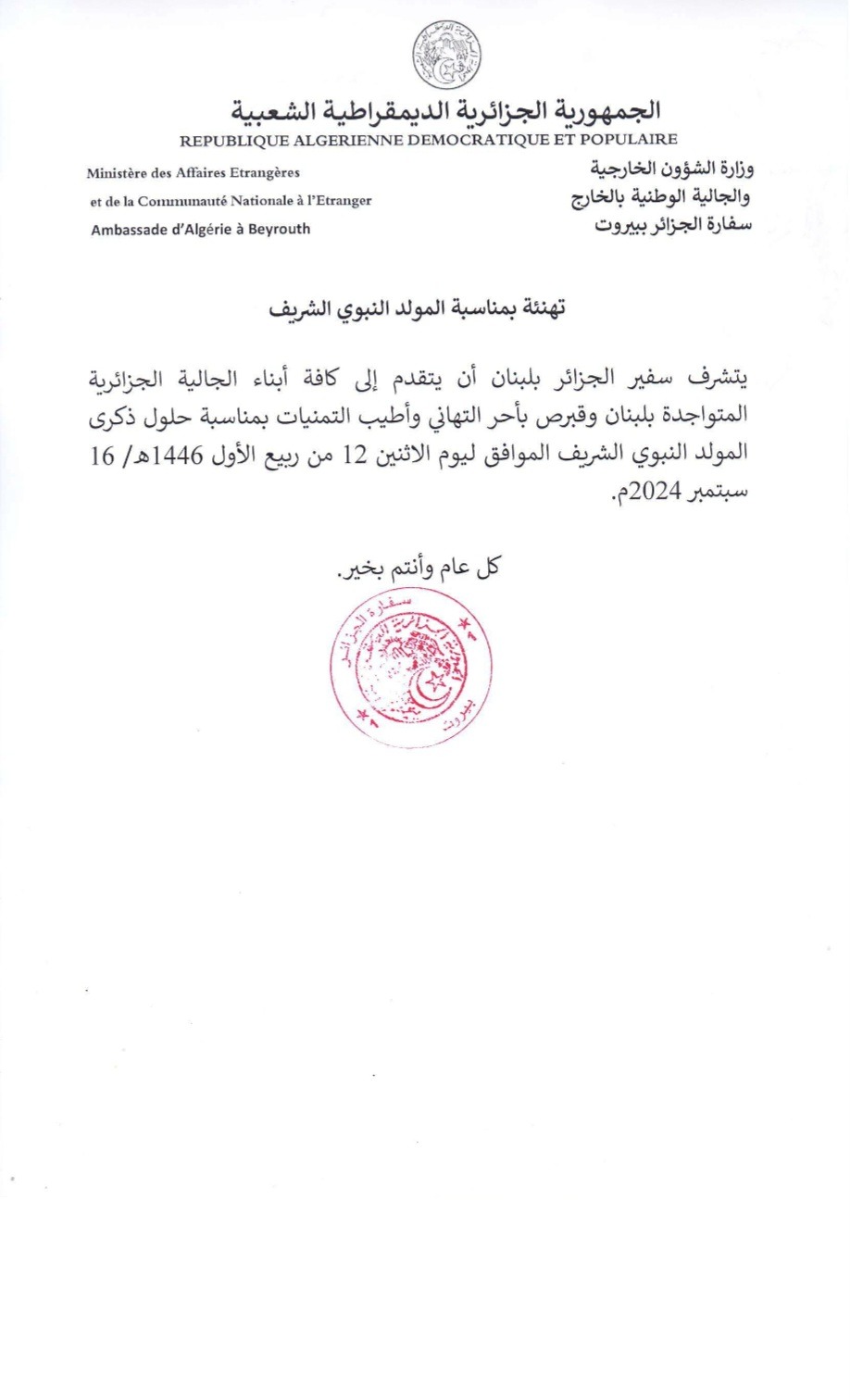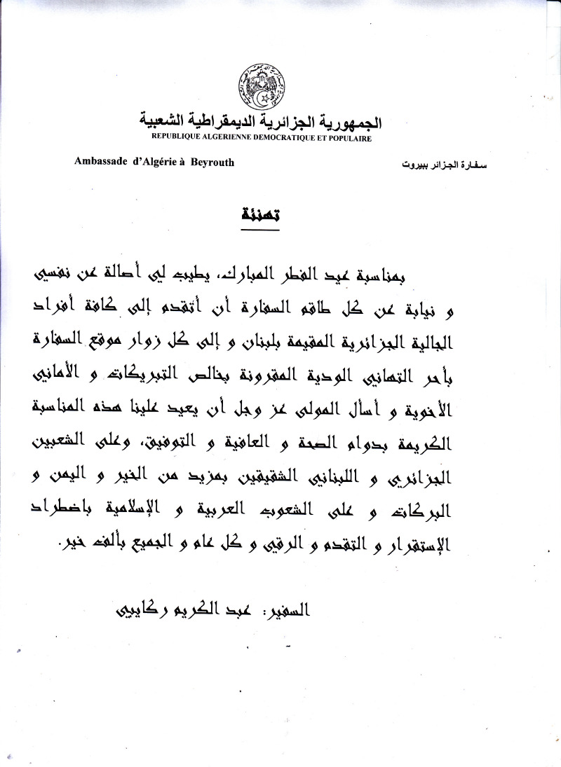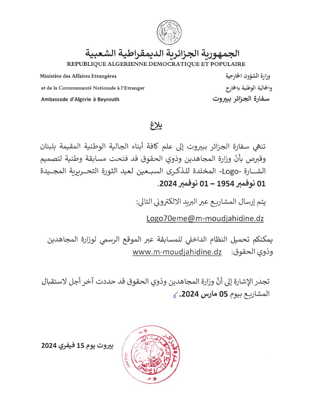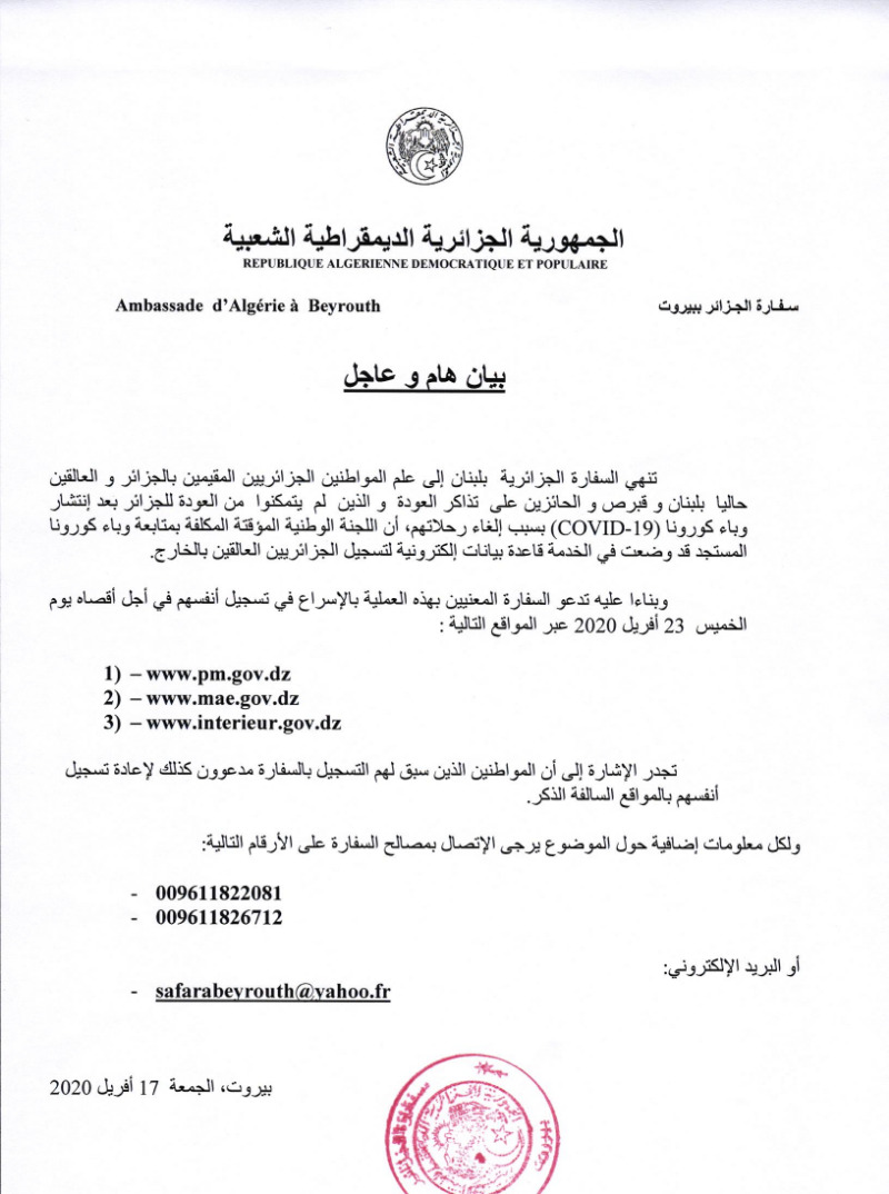 تنهي سفارة الجزائر ببيروت إلى علم كافة أفراد جاليتنا المقيمة بلبن... اقرأ المزيد