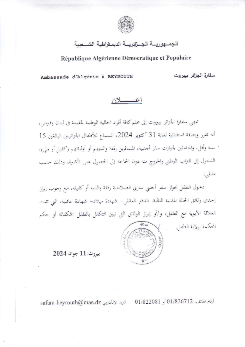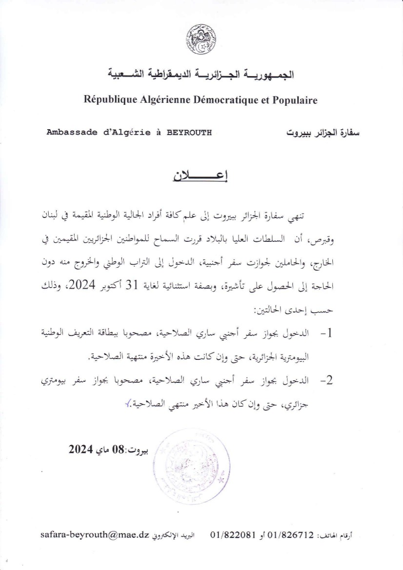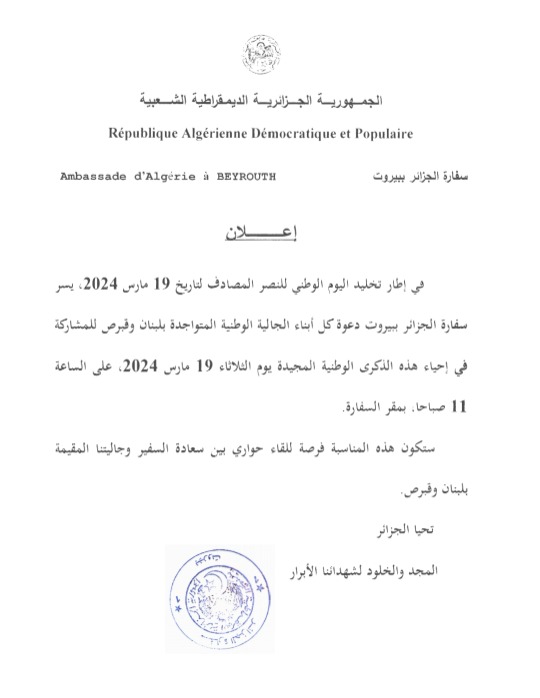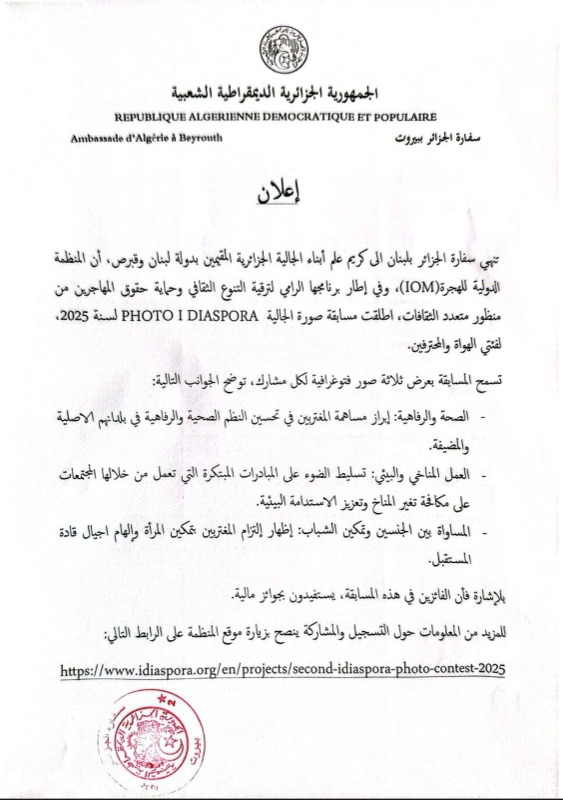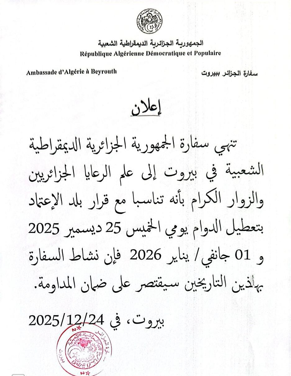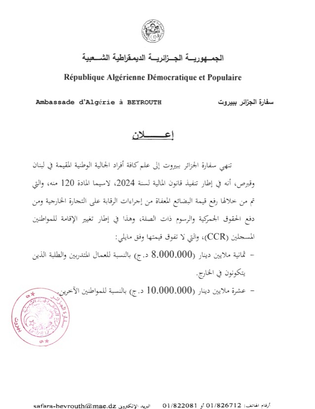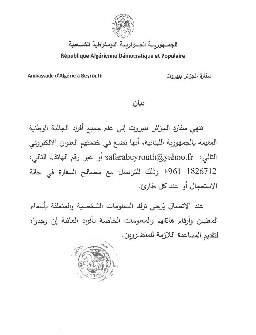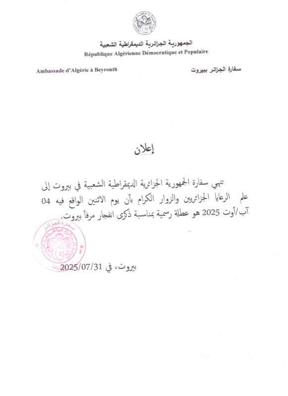 تعلن سفارة الجزائر في لبنان "أفراد الجالية الجزائرية المق... اقرأ المزيد