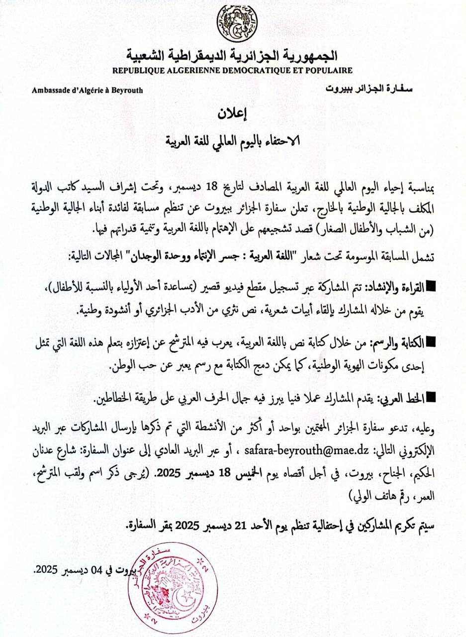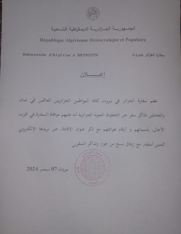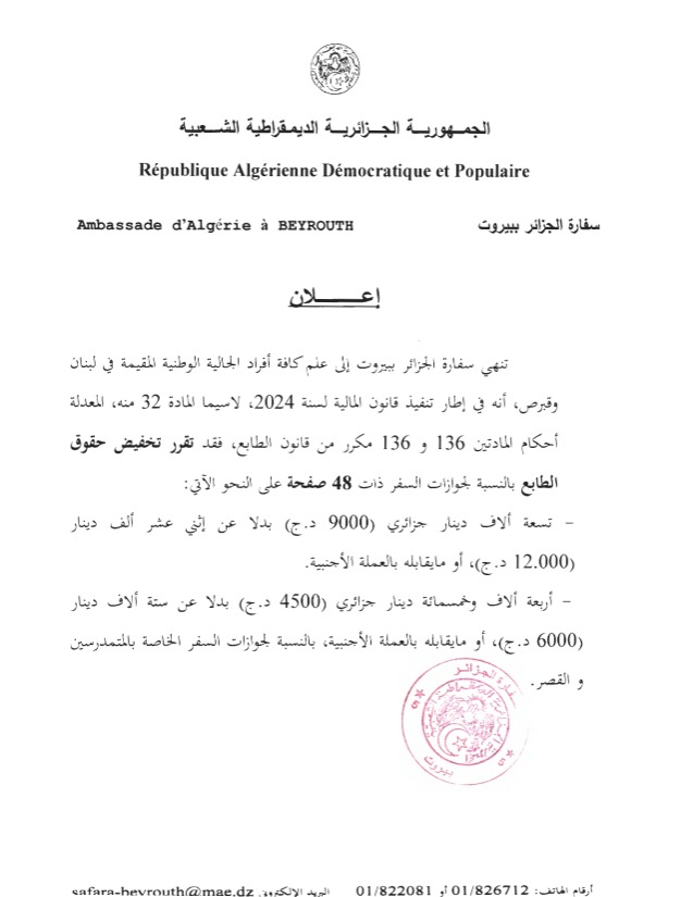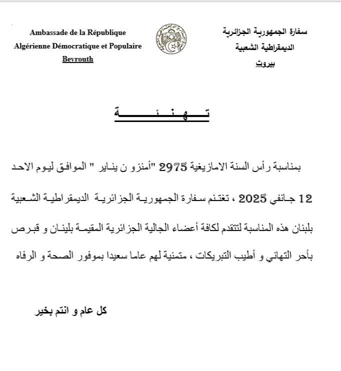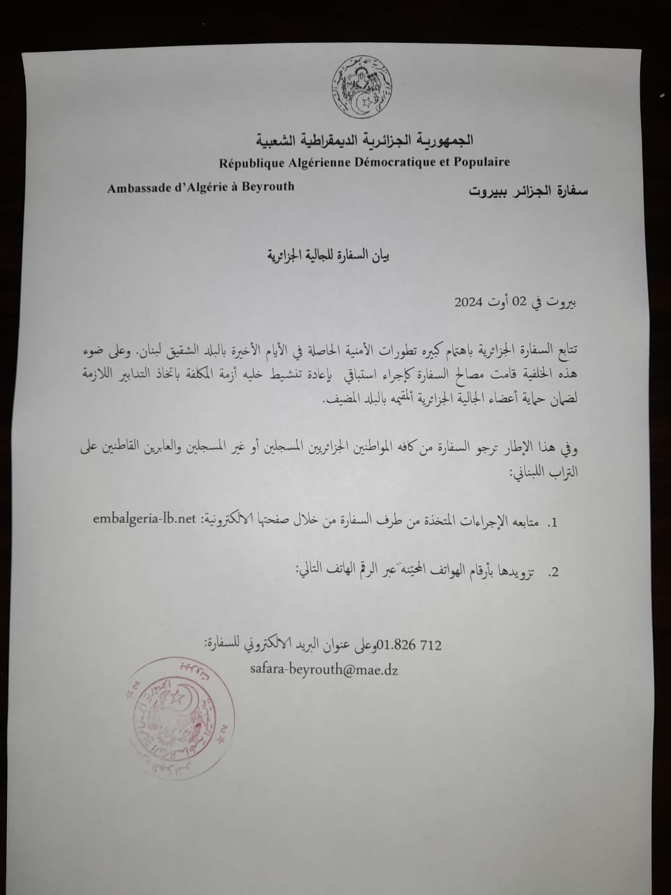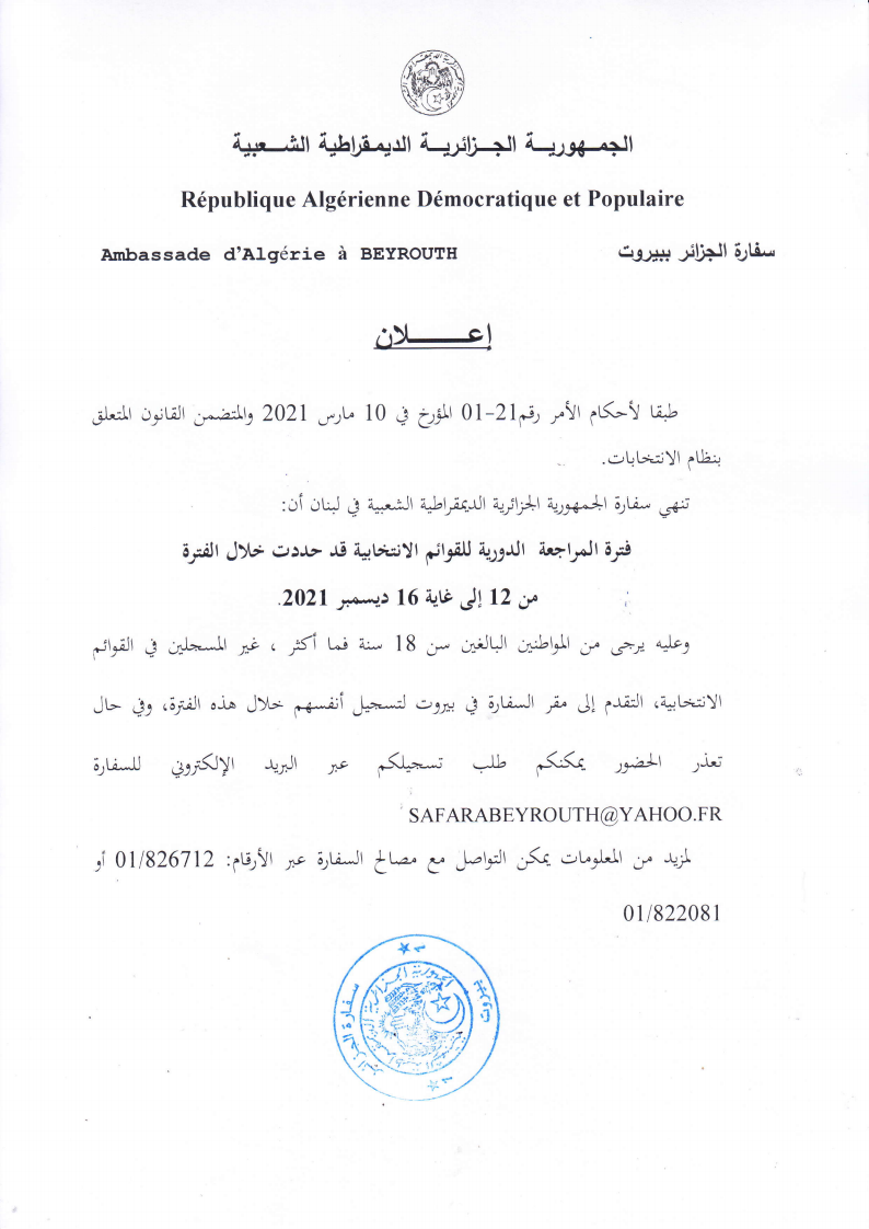 تعلن سفارة الجزائر في لبنان "أفراد الجالية الجزائرية المق... اقرأ المزيد