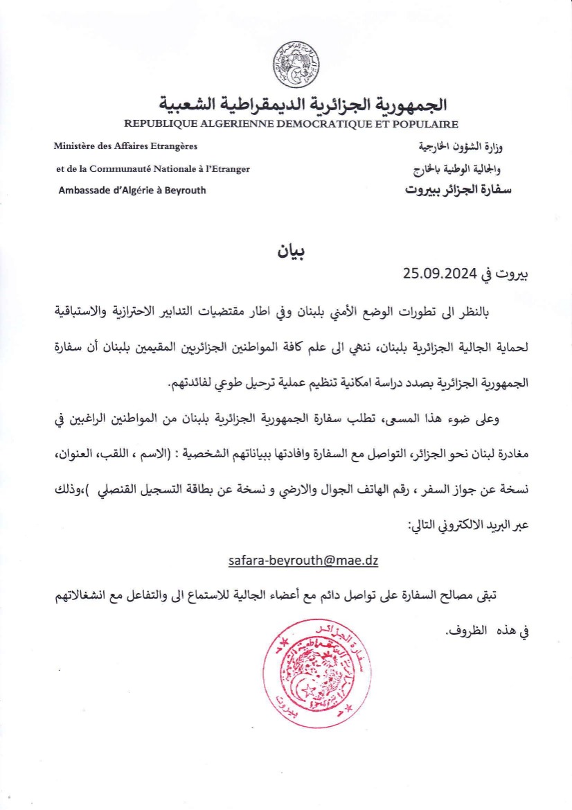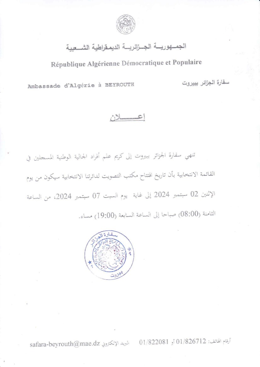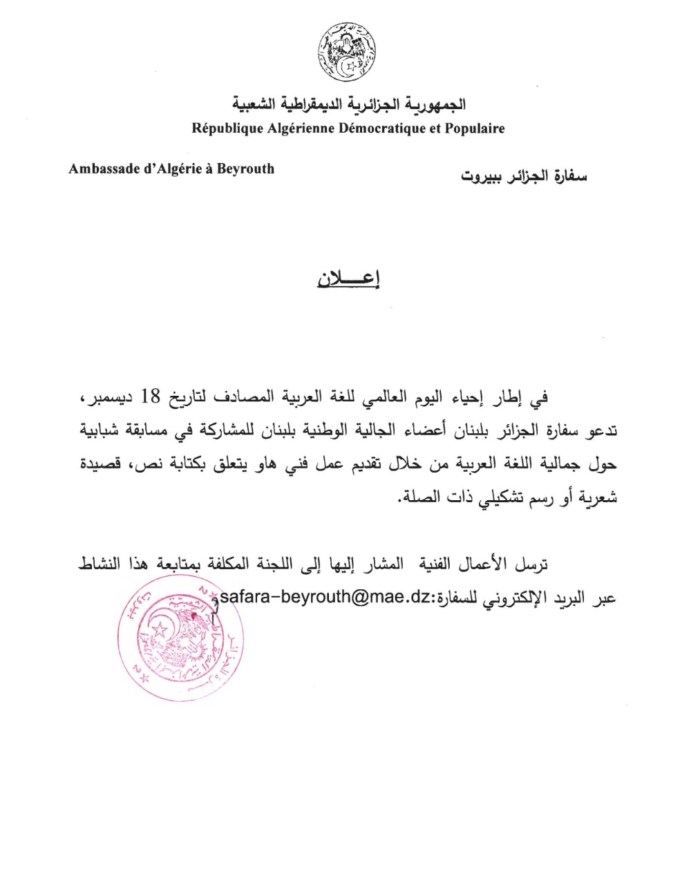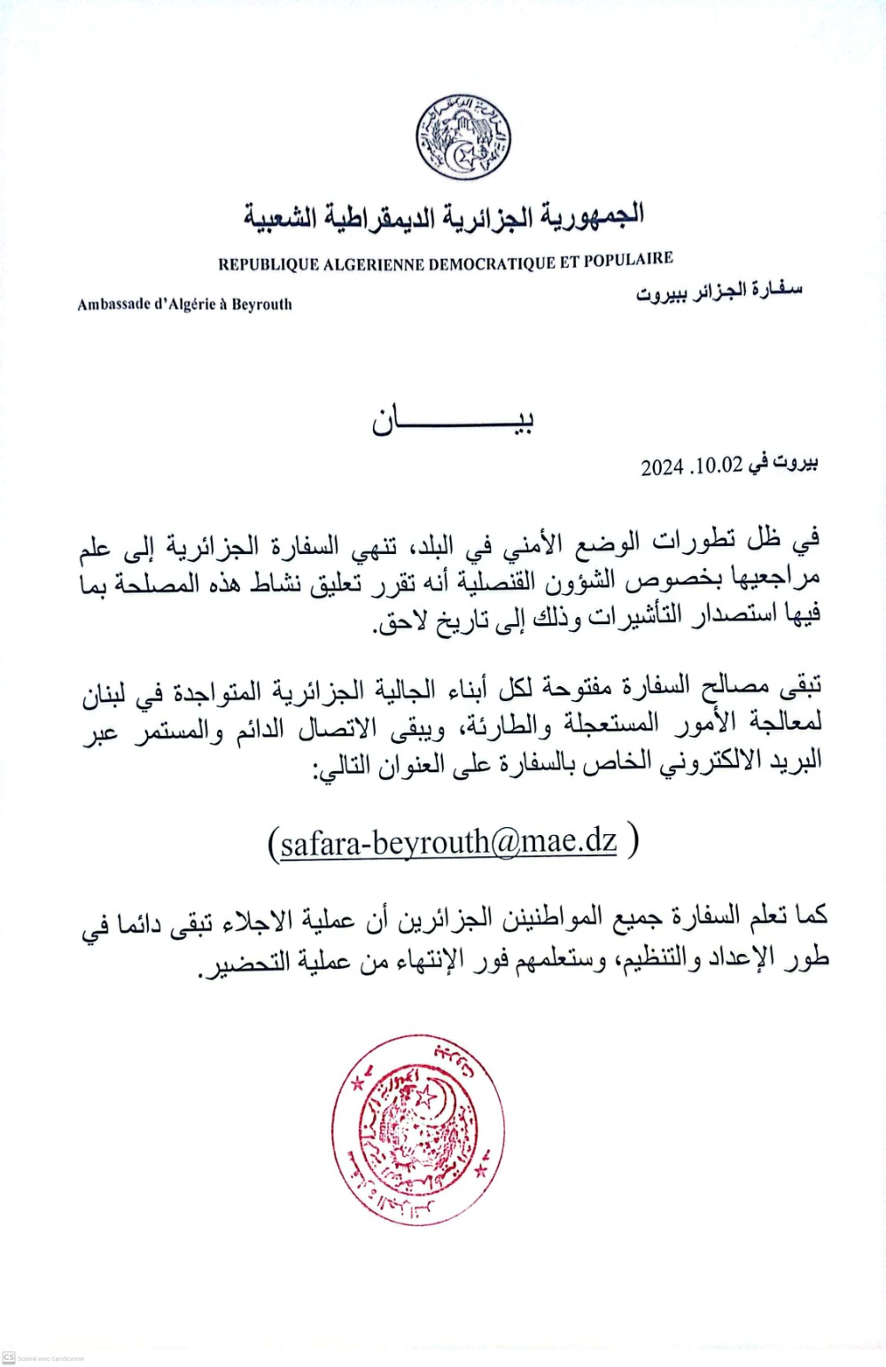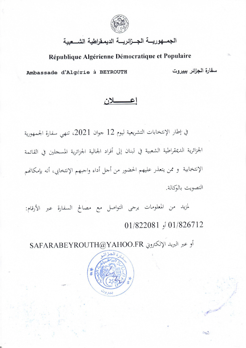 تعلن سفارة الجزائر في لبنان "أفراد الجالية الجزائرية المق... اقرأ المزيد