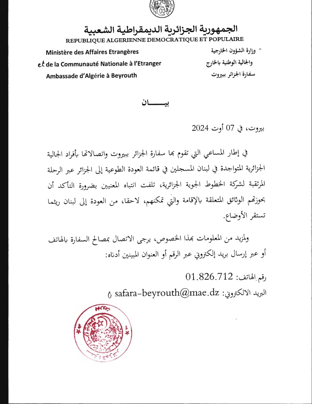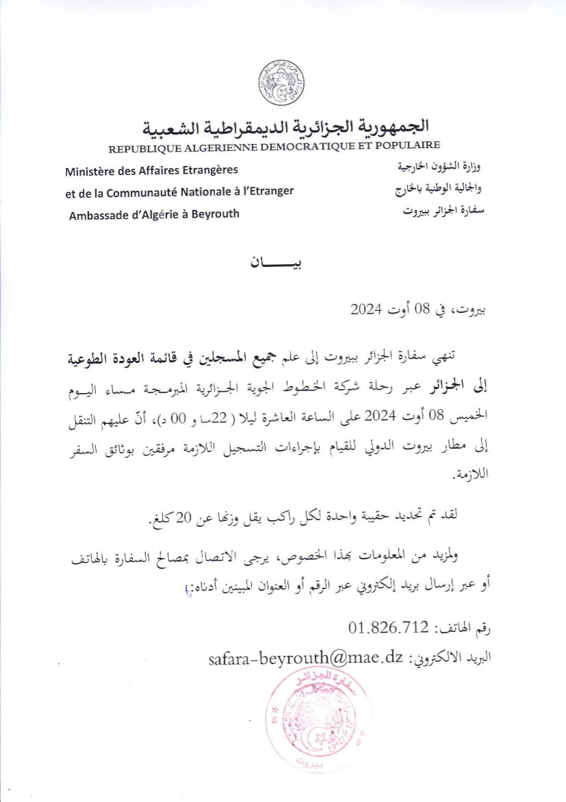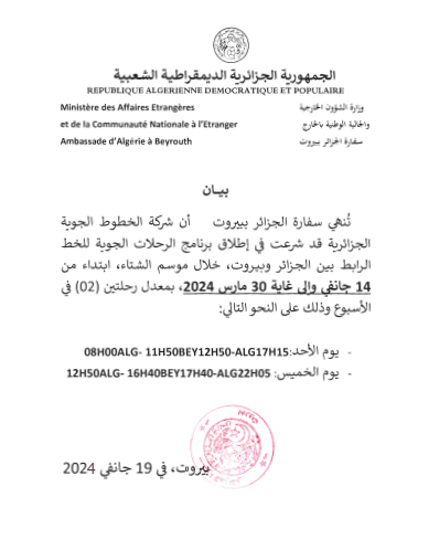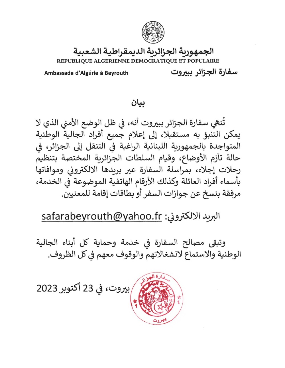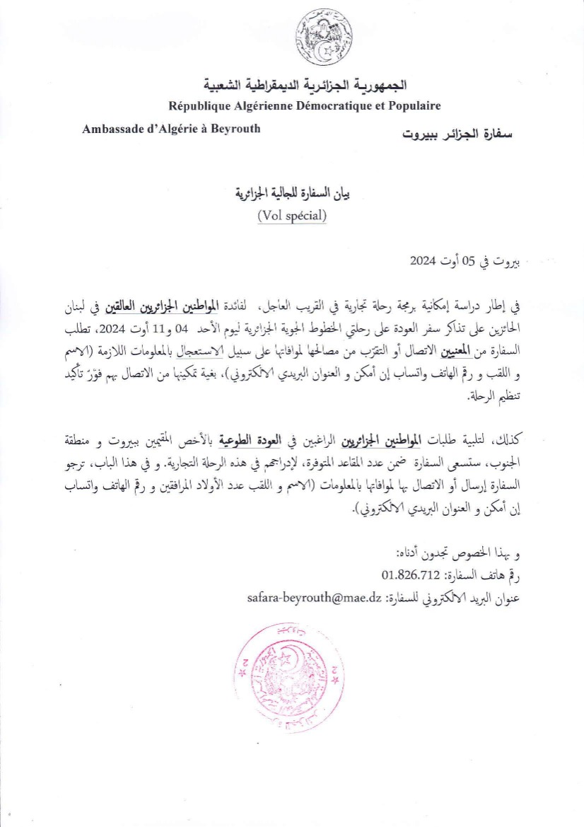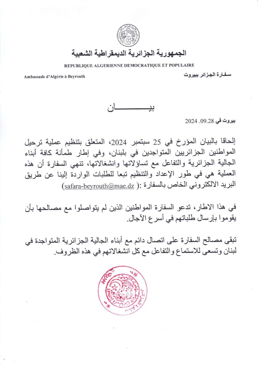 تعلن سفارة الجزائر في لبنان "أفراد الجالية الجزائرية المق... اقرأ المزيد