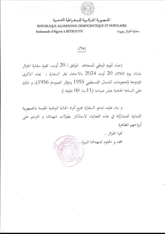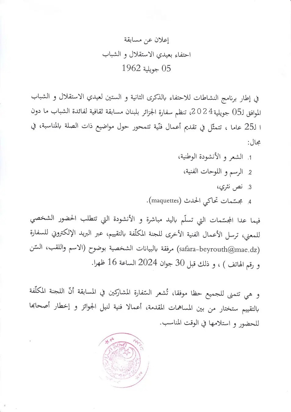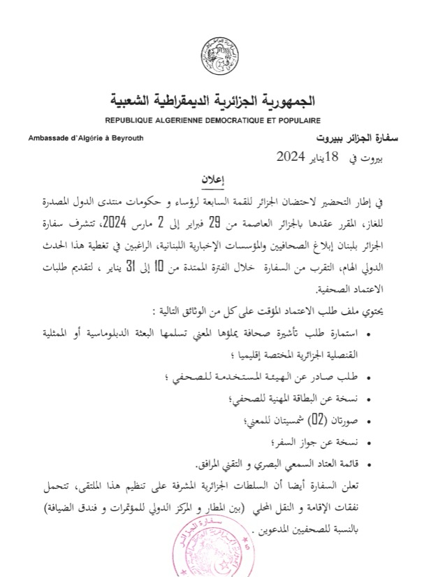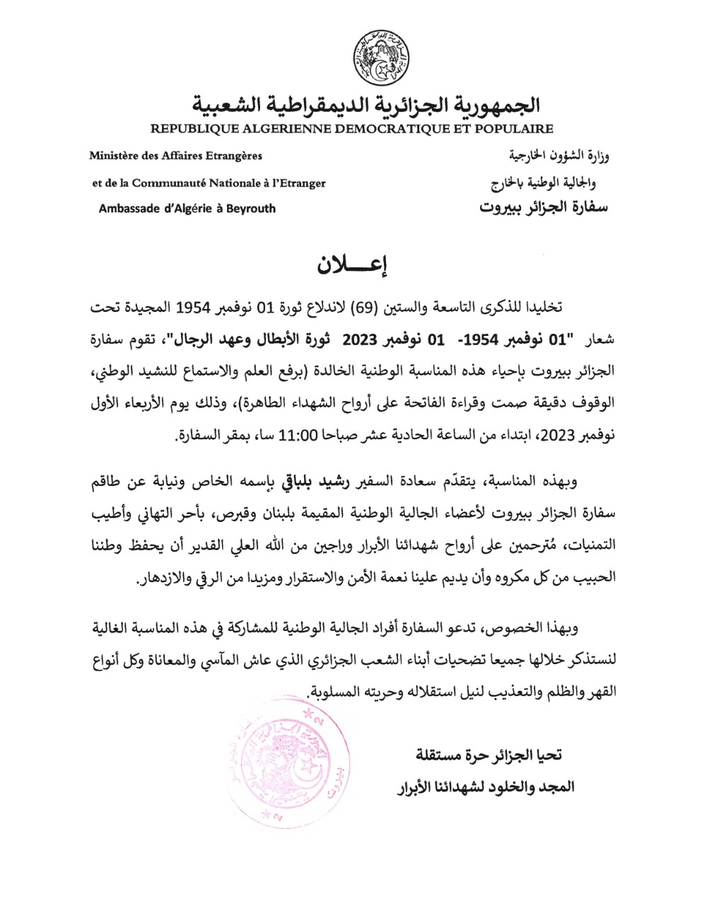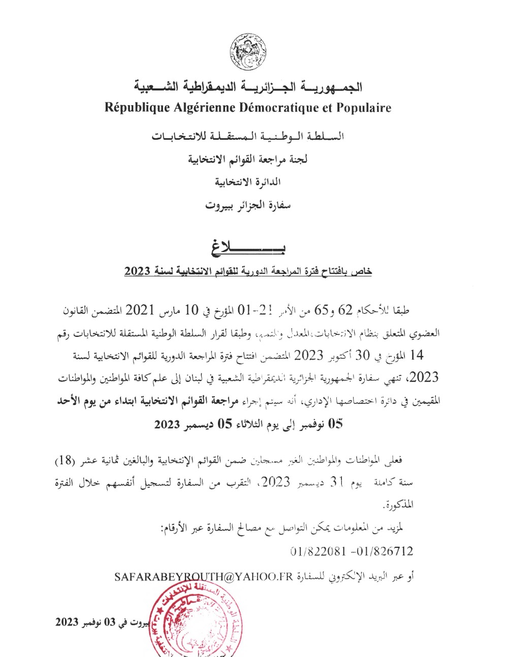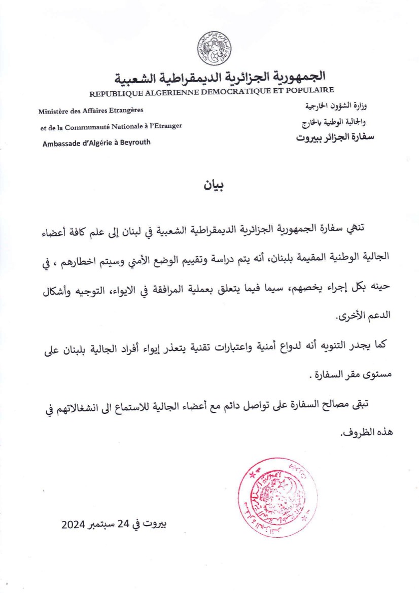 تعلن سفارة الجزائر في لبنان "أفراد الجالية الجزائرية المق... اقرأ المزيد
