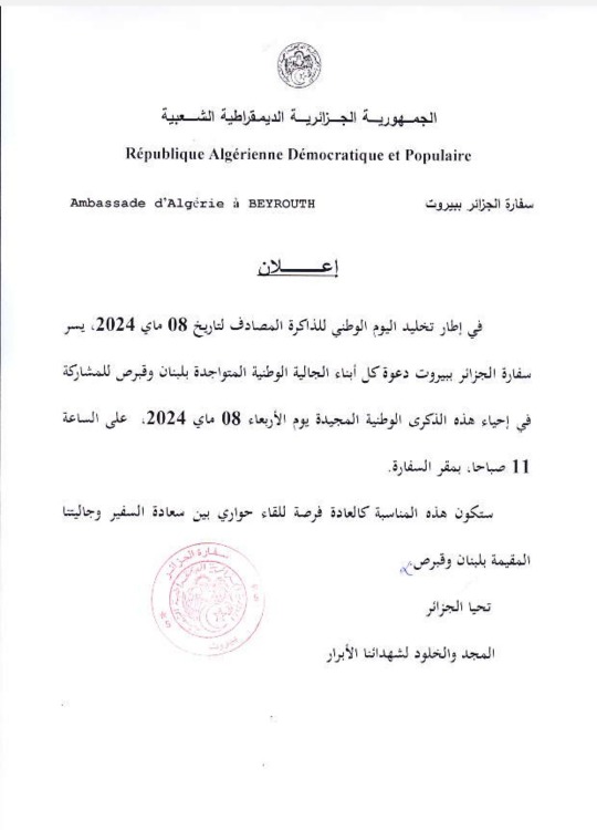 سفارة الجزائر في بيروت تُحيي الذكرى الـ80 لمجازر 8 ماي 1945: ... اقرأ المزيد