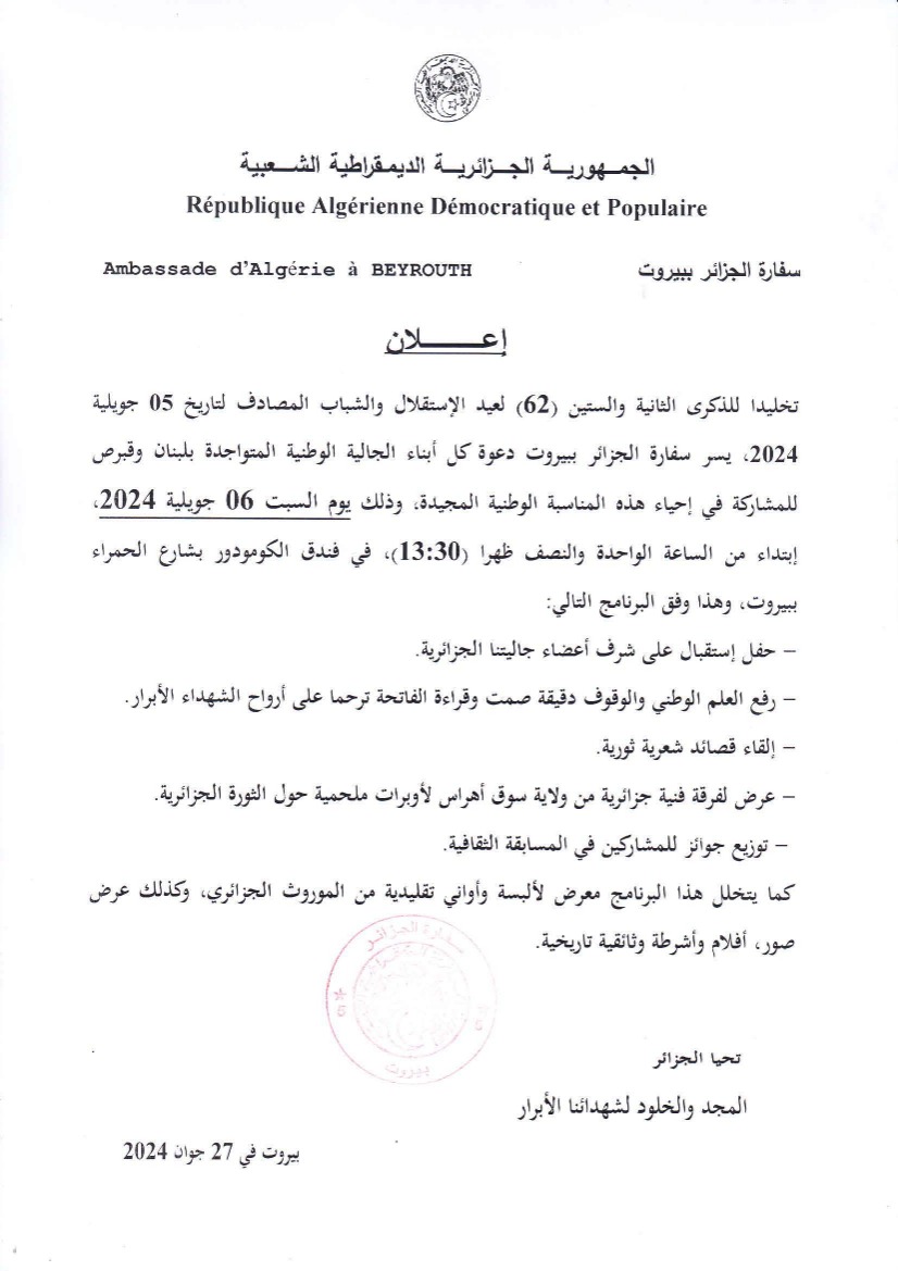 تنهي سفارة الجمهورية الجزائرية الديمقراطية الشعبية في بيروت إل... اقرأ المزيد
