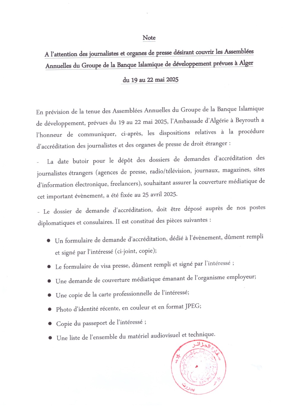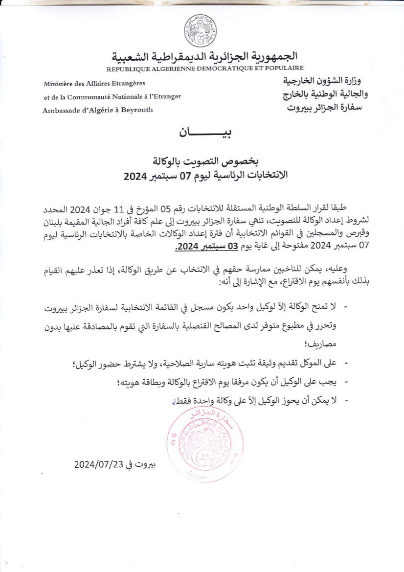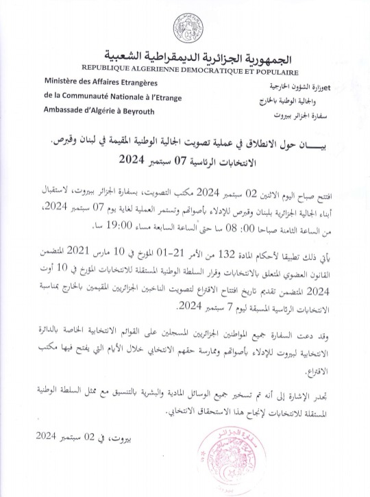 تنهي سفارة الجزائر ببيروت إلى علم أفراد الجالية الجزائرية المقيمة... اقرأ المزيد