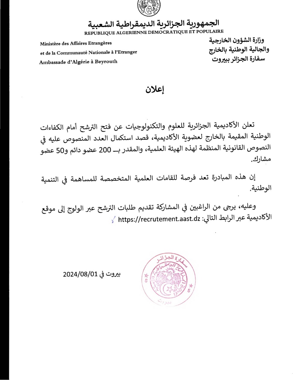 تعلن سفارة الجزائر ببيروت بأنّ وزارة التعليم العالي والبحث العلمي... اقرأ المزيد