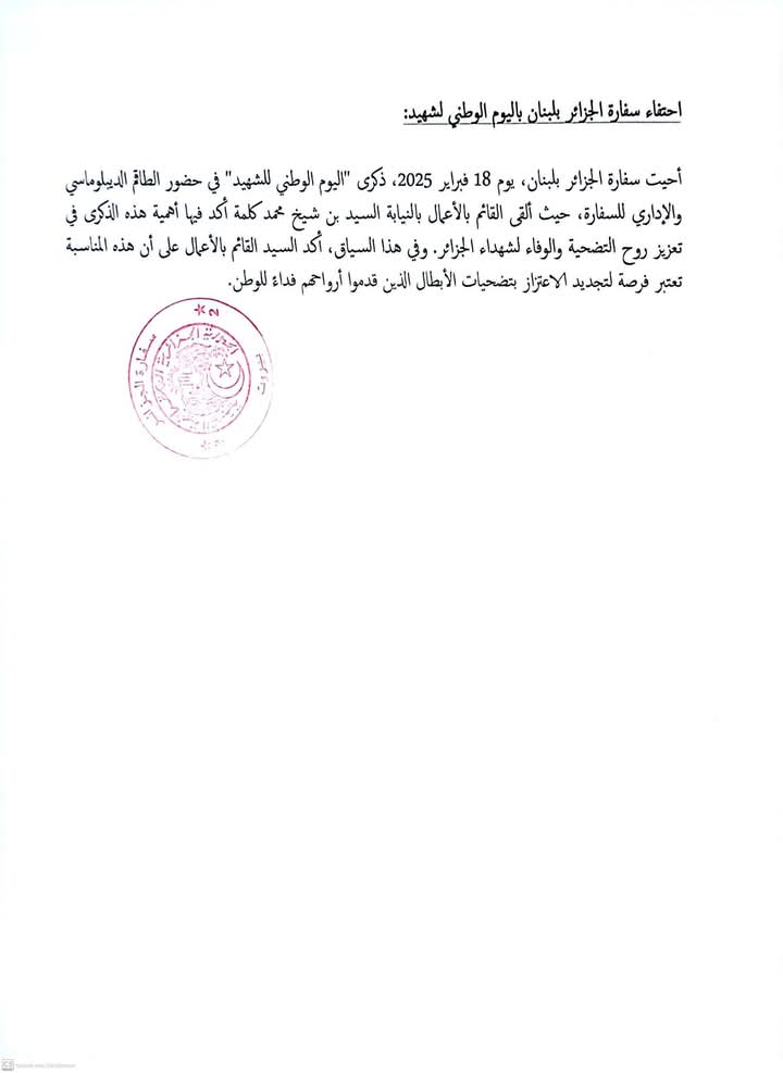 بيروت في 11 ديسمبر 2025 أحيت سفارة الجزائر بلبنان صباح اليوم الذ... اقرأ المزيد
