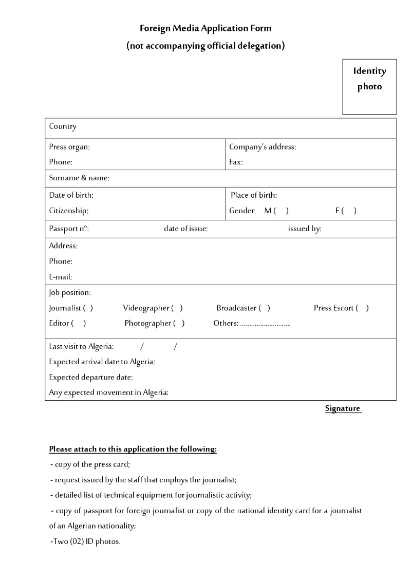 • استمارة "طلب تأشيرة صحافة" يمكن تحميلها من المواقع الالكترونية للممثليات الدبلوماسية والقنصلية الجزائرية بالخارج ويملؤها المعني بعناية؛