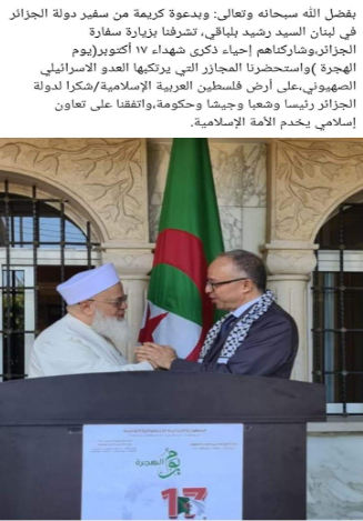 أحيت سفارة الجزائر بلبنان اليوم 17/10/2023 ، الذكرى الوطنية 62 لأحداث المجازر المرتكبة بحق المهاجرين الجزائريين بفرنسا(يوم الهجرة)،و بهذه المناسبة التاريخية ألقى سعادة سفير الجزائر بلبنان، السيد رشيد بلباقي، كلمة تخلد الحدث الفظيع وذلك في سياق مراسيم شملت رفع العلم مرافقا بالنشيد الوطني وقراءة الفاتحة والوقوف دقيقة صمت ترحما على أرواح الشهداء. جرى هذا الإحتفال، بحضور الطاقم الدبلوماسي والإداري والأعوان المتعاقدين للسفارة وجمع من أعضاء الجالية الوطنية ببيروت.