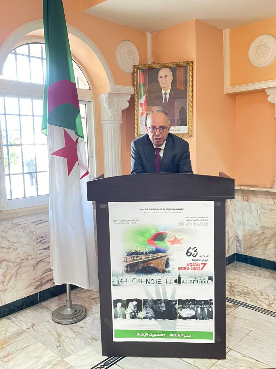 أشرف صباح اليوم الخميس 17 أكتوبر 2024 السيد رشيد بلباقي، سفير الجزائر بلبنان على إحياء الذكرى 63 المخلدة لمظاهرات 17 أكتوبر 1961، تحت شعار "فخر الانتماء ... ومسيرة الوفاء"، بتنظيم وقفة تم خلالها رفع العلم الوطني والاستماع للنشيد الوطني وقراءة فاتحة الكتاب على أرواح الشهداء الزكية الذين ضحوا بأنفسهم من أجل استقلال الجزائر، والقاء كلمة موجزة بهذه المناسبة التاريخية.
