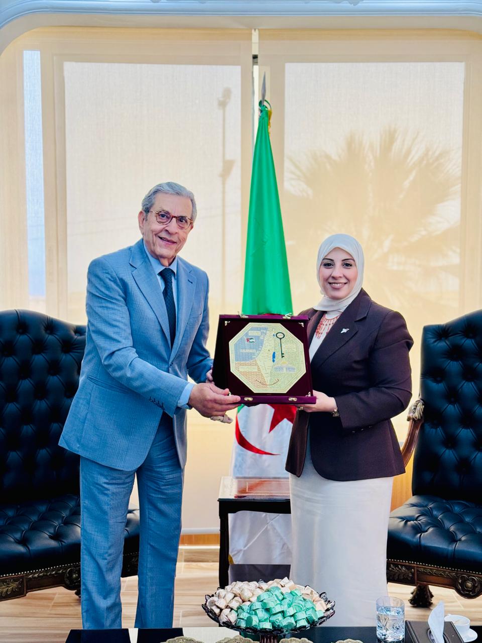 وفي لفتة تقديرية، قدّمت السيدة بهاني درعًا تكريميًا لسعادة السفير عربون احترام وتقدير. وقد أعرب سعادة السفير كمال بوشامة عن شكره وامتنانه لهذه المبادرة، مؤكدًا على ثبات الموقف الجزائري الداعم لحقوق الشعب الفلسطيني، وعلى أهمية الإعلام الحر في تعزيز الوعي بالقضايا العادلة ونقل الحقيقة بمهنية ومسؤولية.