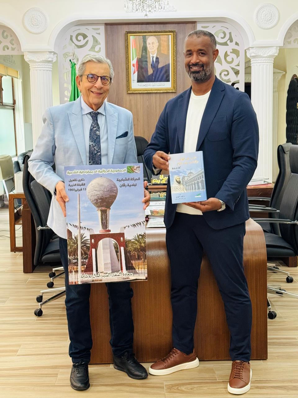 وبهذه المناسبة، قدّم السيد محمد رقاني إلى سعادة السفير لوحة تذكارية من بلدية رقان بالجزائر، تحمل رمزية تاريخية عميقة مرتبطة بذكرى التفجير النووي الفرنسي الذي وقع في 13 شباط/فبراير 1960 في منطقة رقان، وهي مسقط رأسه. وفي المقابل، أهدى سعادة السفير كمال بوشامة أحد مؤلفاته الموسومة “الأمير عبد القادر وجزائريو بلاد الشام”، في تعبير متبادل عن التقدير والاعتزاز بالذاكرة الوطنية.